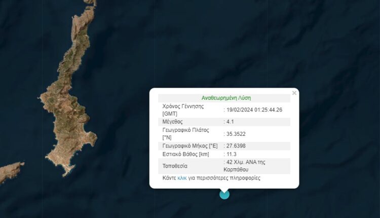 Σεισμός μεγέθους 4,1 βαθμών της κλίμακας Ρίχτερ σημειώθηκε τα ξημερώματα στον θαλάσσιο χώρο ανοιχτά της Καρπάθου.
