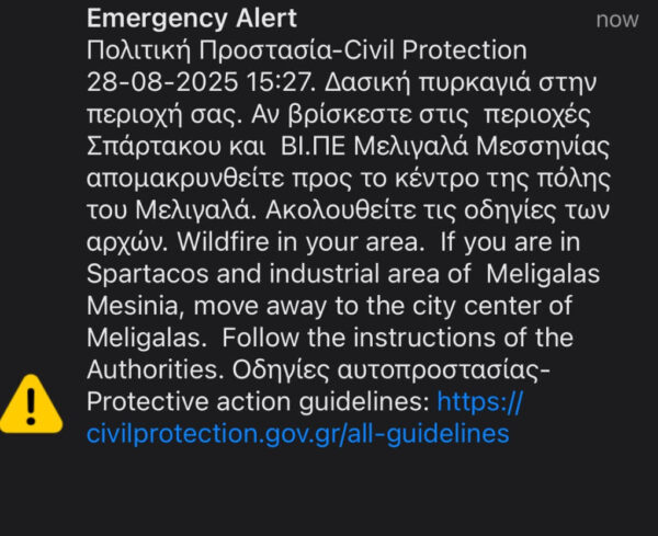 Λίγο μετά τις 3 το μεσημέρι ήχησε το 112 προτρέποντας τους κατοίκους να απομακρυνθούν προς το κέντρο του Μελιγαλά.