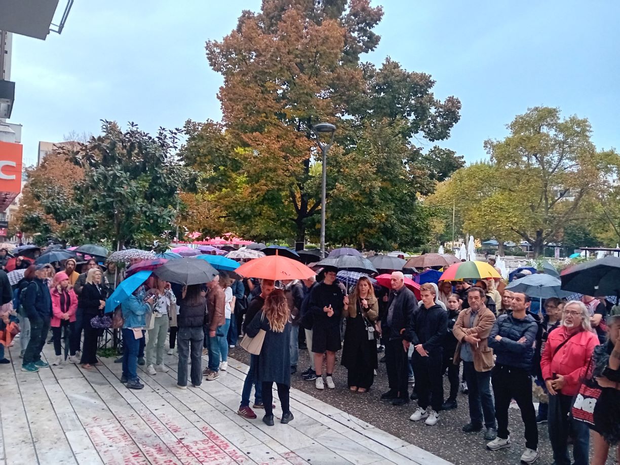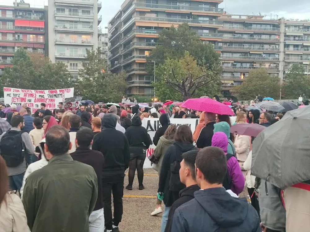 Παρά τη βροχή, πλήθος πολιτών, ανάμεσά τους και συγγενείς θυμάτων της σιδηροδρομικής τραγωδίας, συγκεντρώθηκαν στο «Δέντρο της Μνήμης», στη Νέα Παραλία στη Θεσσαλονίκη.