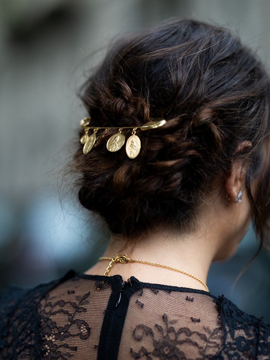 Φολκόρ αξεσουάρ: Τα μαλλιά είναι μαζεμένα απλά και ανεπιτήδευτα σε ένα low bun αλλά το αξεσουάρ χαρίζει στο look την τέλεια πινελιά. Φολκρόρ, σε σχήμα παραμάνας και τα φλουριά-τάματα να είναι statement.