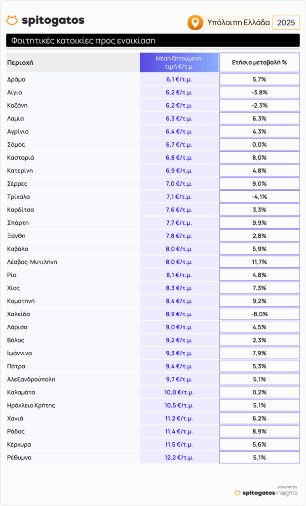 Οι χαμηλότερες μέσες ζητούμενες τιμές ενοικίασης φοιτητικών κατοικιών (κάτω των 7,0 €/τ.μ.) σημειώνονται και πάλι σε Δράμα, Αίγιο, Κοζάνη, Λαμία, Αγρίνιο, Σάμο, Καστοριά και Κατερίνη.