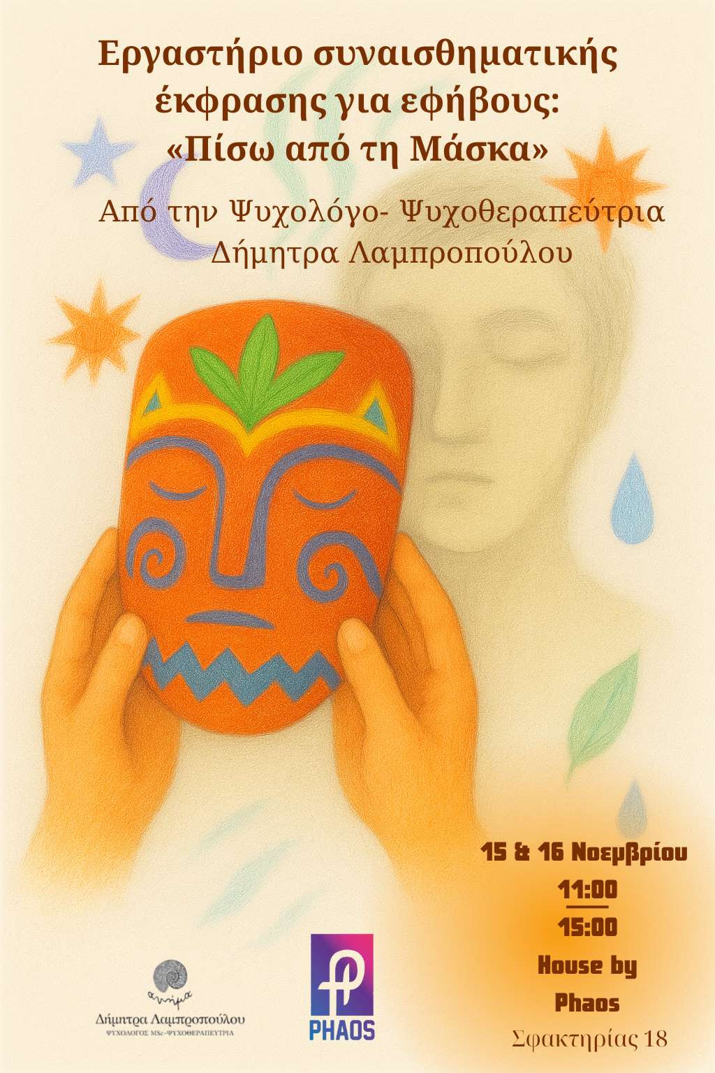 Διήμερο βιωματικό εργαστήριο για εφήβους 12–15 ετών με τίτλο «Πίσω από τη Μάσκα» με τη Ψυχολόγο – Ψυχοθεραπεύτρια Δήμητρα Λαμπροπούλου στο House by Phaos