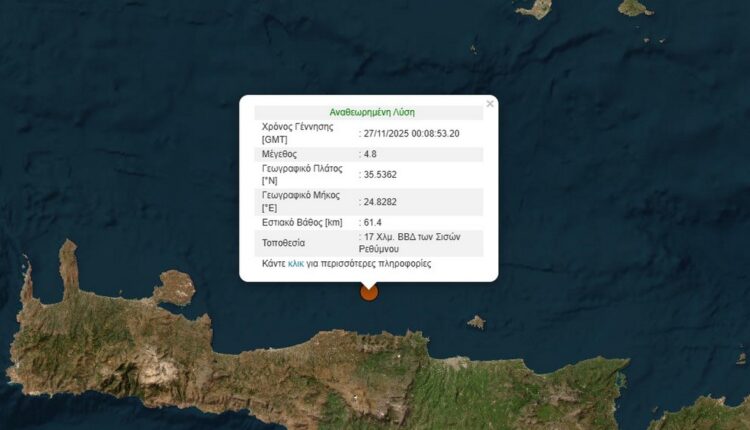 Σεισμός 4,8 Ρίχτερ ανοιχτά της Κρήτης