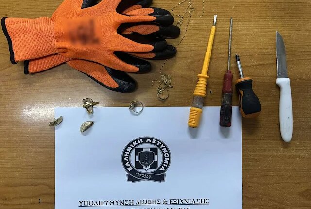 Σε έλεγχο, που έγινε σε όχημα, στο οποίο επέβαιναν οι συλληφθέντες, βρέθηκε μέρος των αφαιρεθέντων και αποδόθηκε στην παθούσα, ενώ επίσης βρέθηκαν και κατασχέθηκαν διαρρηκτικά εργαλεία, γάντια και μαχαίρι.