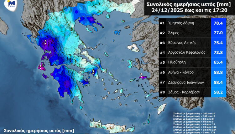 Σύμφωνα με δίκτυο αυτόματων μετεωρολογικών σταθμών του Εθνικού Αστεροσκοπείου Αθηνών / Meteo.gr μεγάλα ύψη βροχής καταγράφηκαν στα δυτικά ηπειρωτικά και στην Αττική, όπως αποτυπώνεται στη χρωματική κλίματα του Χάρτη 1, με το μεγαλύτερο ύψος βροχής μέχρι και τις 17:20 ώρα Ελλάδας να καταγράφεται στη Δάφνη Αττικής με 78 mm.