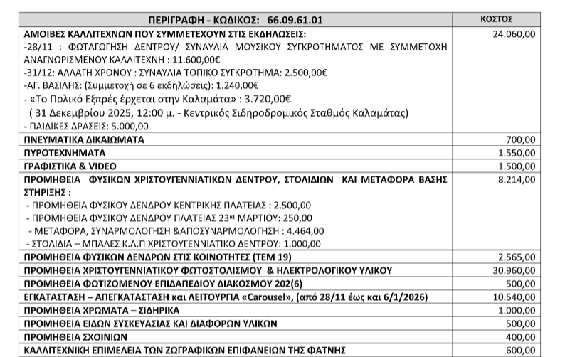 Τι ανέφερε στην εισήγησή του ο Πρόεδρος της ΦΑΡΙΣ Σωτήρης Κριτσωτάκης: “Με την ευκαιρία των εορτών των Χριστουγέννων και της Πρωτοχρονιάς, ο Δήμος Καλαμάτας, σε συνεργασία με την Κοινωφελή Επιχείρηση «ΦΑΡΙΣ», επιθυμεί να δημιουργήσει μια ζεστή και χαρούμενη χριστουγεννιάτικη ατμόσφαιρα σε όλη την πόλη και τις Κοινότητες, προσφέροντας παράλληλα στους δημότες και τους επισκέπτες ποιοτικές πολιτιστικές εμπειρίες. Για τον λόγο αυτό προτείνεται η υλοποίηση του χριστουγεννιάτικου στολισμού και η διοργάνωση εορταστικών εκδηλώσεων με καταληκτική ημερομηνία έναρξης την 28η Νοεμβρίου 2025.