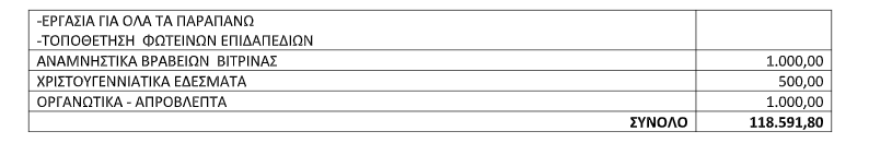 Οι συνολικές δαπάνες προετοιμασίας και εκτέλεσης των εικαστικών παρεμβάσεων και της διοργάνωσης εκδηλώσεων, προϋπολογίζονται ότι θα ανέλθουν στο ποσό των 114.466 € και αναλυτικά αφορούν: