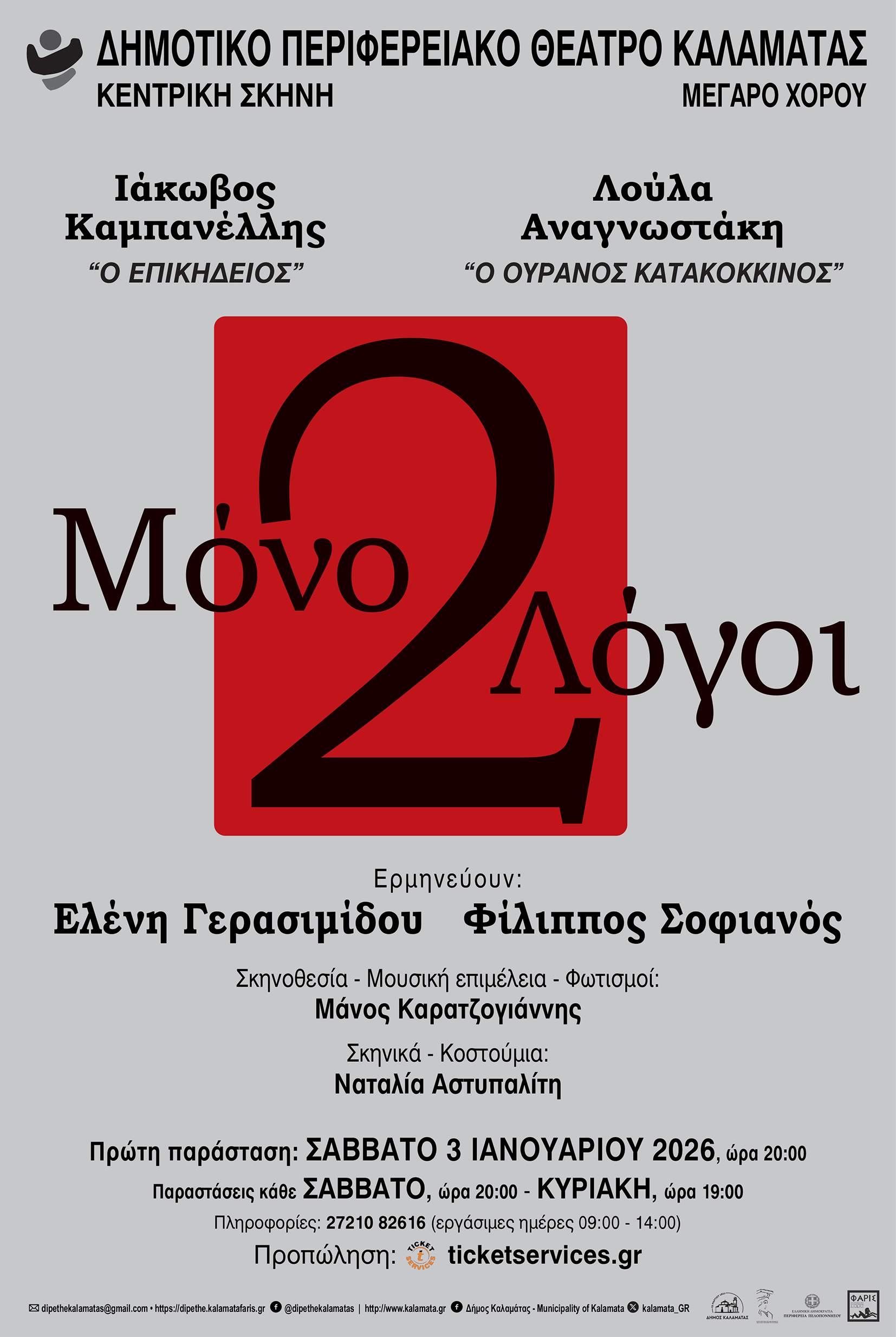 Η Χειμερινή Παραγωγή της Κεντρικής Σκηνής του ΔΗ.ΠΕ.ΘΕ Καλαμάτας θα αποτελείται από δύο κεφαλαιώδη θεατρικά κείμενα της ελληνικής δραματουργίας: «Ο Επικήδειος», έναν μονόλογο του Ιάκωβου Καμπανέλλη και «Ο Ουρανός Κατακόκκινος» έναν μονόλογο της Λούλας Αναγνωστάκη, δύο συγγραφείς που σφράγισαν με το έργο τους το ελληνικό θέατρο του 20ού αιώνα.