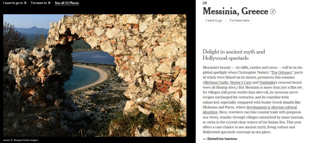 “Απόλαυση στον αρχαίο μύθο και το θέαμα του Χόλιγουντ” είναι ο τίτλος του σχετικού άρθρου για τη Μεσσηνία, όπου και γίνεται αναφορά στην χολιγουντιανή ταινία του Κρίστοφερ Νόλαν, “Οδύσσεια” με γυρίσματα στην περιοχή της Πύλου, που θα κάνει πρεμιέρα το προσεχές καλοκαίρι. Με αφορμή λοιπόν αυτό, ο αρθρογράφος ελληνικής καταγωγής Δημήτρης Ιωάννου, προτείνει τη Μεσσηνία ως ταξιδιωτικό προορισμό για το 2026, υπογραμμίζοντας ότι η Μεσσηνία είναι κάτι περισσότερο από ένα κινηματογραφικό σκηνικό, με αναφορά στα χωριά της, στο ελαιόλαδο, στη γαστρονομική της παράδοση, ενώ γίνεται και αντιπαραβολή με τη Μύκονο και την Πάρο, επισημαίνοντας ότι η Μεσσηνία παραμένει αυθεντική χωρίς να έχει μεταβληθεί η πολιτιστική της ταυτότητα, χωρίς να έχει επηρεαστεί από τον μαζικό τουρισμό, και προτείνει περιπάτους στα γραφικά μονοπάτια της, και εξόρμηση στα χωριά της. Συγκεκριμένα αναφέρονται τα εξής από τον δημοσιογράφο Demetrios Ioannou: