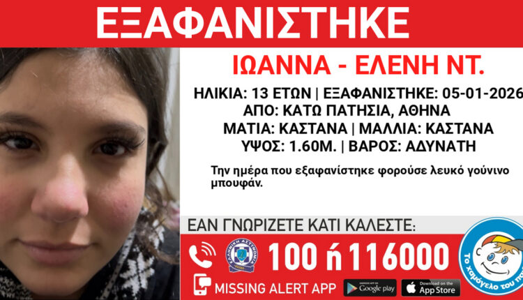 Συναγερμός έχει σημάνει για την εξαφάνιση μιας 13χρονης στα Κάτω Πατήσια, η οποία χάθηκε στις 5 Ιανουαρίου 2026. Την υπόθεση έχει αναλάβει «Το Χαμόγελο του Παιδιού», το οποίο ενημερώθηκε σήμερα για την εξαφάνιση και εξέδωσε Missing Alert προκειμένου να εντοπιστεί το κορίτσι.