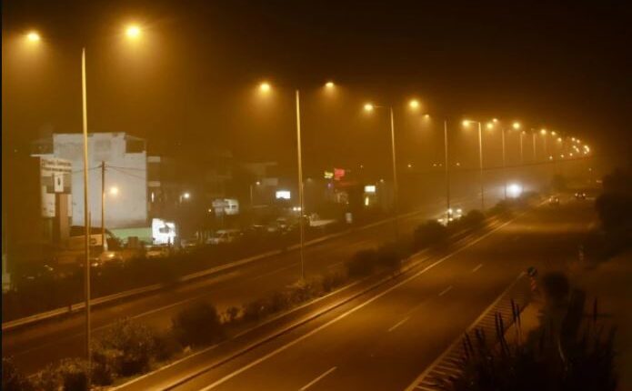 Το neakriti.gr κατέγραψε εικόνες από τον Βόρειο Οδικό Άξονα Κρήτης, όπου τα φώτα των οχημάτων, σε συνδυασμό με την πυκνή σκόνη που αιωρούνταν στον αέρα, δημιουργούσαν σκηνές που θύμιζαν θρίλερ.
