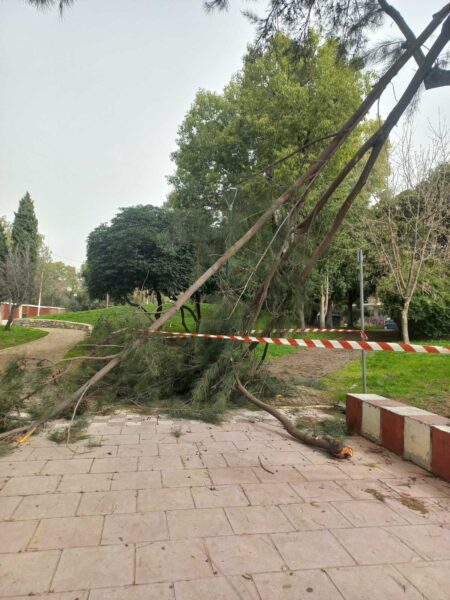 Το σημείο έχει αποκλειστεί από συνεργείο του δήμου για την απομάκρυνση των κλαδιών που έσπασαν και την αποκατάσταση του σημείου.