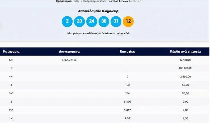 Οι τυχεροί αριθμοί είναι: 2, 23, 24, 30, 31 και ΤΖΟΚΕΡ ο αριθμός 12.