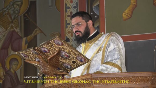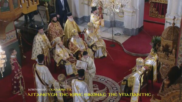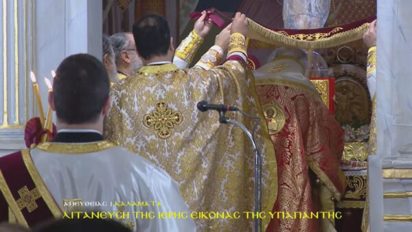 Μετά την ολοκλήρωση της Θείας Λειτουργίας, ακολουθήσε η λιτάνευση της Iερής Eικόνας με τη συμμετοχή Φιλαρμονικών, σε κεντρικές οδούς της πόλης (Υπαπαντής – 23ης Μαρτίου – Αριστομένους – Π. Καίσαρη – Φαρών – Μητροπολίτη Μελετίου – Υπαπαντής), με κατάληξη το Μητροπολιτικό Iερό Nαό.