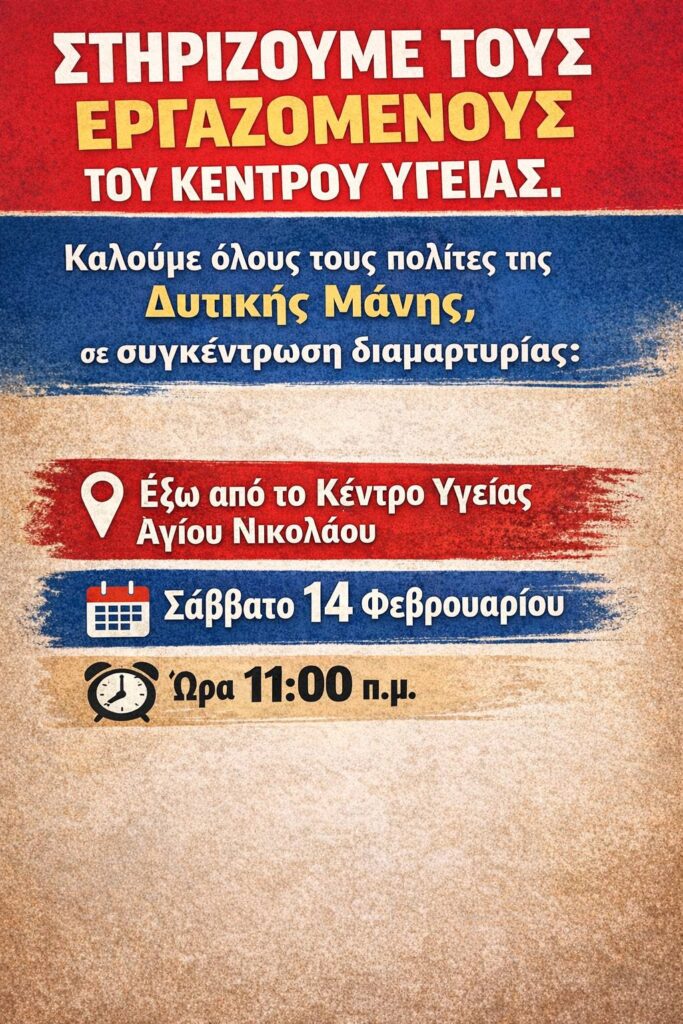 Ξεσηκώνονται οι Μανιάτες και Μανιάτισσες του Δήμου Δυτικής Μάνης διεκδικώντας την στελέχωση του Κέντρου Υγείας Αγίου Νικολάου, συμπαραστεκόμενοι στους γιατρούς και νοσηλευτικό προσωπικό του Κέντρου Υγείας. Το Σάββατο 14 Φεβρουαρίου στις 11.00 το πρωί έχει προγραμματιστεί πάνδημη συγκέντρωση όλων, κατοίκων, συλλόγων, φορέων στον Άγιο Νικόλαο προκειμένου να διαμαρτυρηθούν για τη χρόνια υποστελέχωση που θέτει σε κίνδυνο την περίθαλψη των κατοίκων και οδηγεί στην εργασιακή εξουθένωση το ιατρικό και νοσηλευτικό προσωπικό του Κέντρου Υγείας που καταβάλλουν υπεράνθρωπες προσπάθειες για να ανταποκριθούν στα αυξημένα περιστατικά υγείας. Είχε άλλωστε προηγηθεί η ανοιχτή επιστολή των νοσηλευτών και νοσηλευτριών του Κέντρου Υγείας, αλλά και η Ερώτηση από του ΚΚΕ στη Βουλή για το πρόβλημα και την ανάγκη άμεσης στελέχωσης με προσωπικό του Κέντρου Υγείας. Οι κάτοικοι, ο Δήμος, οι φορείς αποφάσισαν να πάρουν την κατάσταση στα χέρια τους και να απαιτήσουν τα αυτονόητα. Ισότιμη πρόσβαση στην υγεία και την περίθαλψη με πλήρως στελεχωμένο το Κέντρο Υγείας του Αγίου Νικολάου.