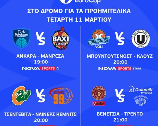 Το EuroCup επιστρέφει στην αγωνιστική δράση με το τζάμπολ στη φάση των «16» και οι συνδρομητές θα απολαύσουν τους αγώνες Άνκαρα-Μανρέσα (11/3, 19:00), Μπουντούτσνοστ-Κλουζ Ναπόκα (11/3, 20:00),Τσεντεβίτα Ολίμπια-Νάινερς (11/3, 20:00) και Βενέτσια-Τρέντο (11/3, 21:00).