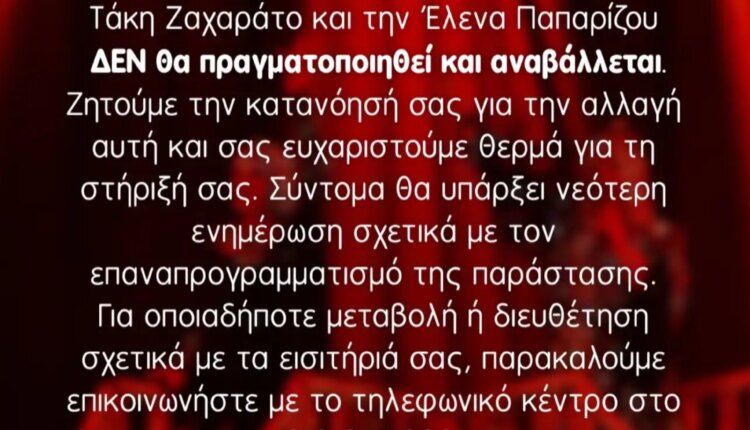 «Αγαπητοί πελάτες, θα θέλαμε να σας ενημερώσουμε ότι η προγραμματισμένη για σήμερα παράσταση “The velvet night” στο NOX με τον Τάκη Ζαχαράτο και την Έλενα Παπαρίζου, δεν θα πραγματοποιηθεί και αναβάλλεται. Ζητούμε την κατανόηση σας για την αλλαγή αυτή και σας ευχαριστούμε θερμά για την στήριξή σας. Σύντομα θα υπάρξει νεότερη ενημέρωση σχετικά με τον επαναπρογραμματισμό της παράστασης. Για οποιαδήποτε μεταβολή η διευθέτηση σχετικά με τα εισιτήρια σας, παρακαλούμε επικοινωνήστε με το τηλεφωνικό κέντρο. Σας ευχαριστούμε για την κατανόηση και την συνεργασία».