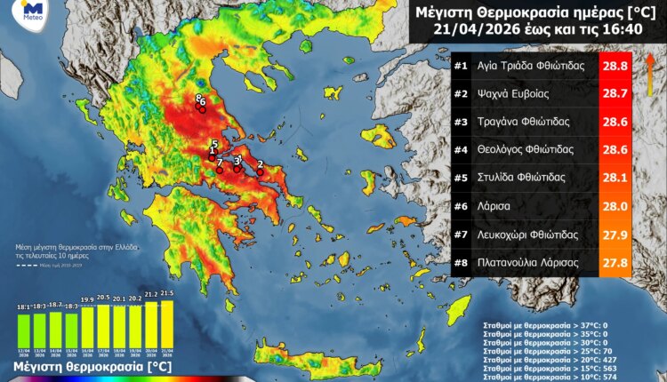 Οι νεφώσεις που κατά διαστήματα ήταν πυκνές στα βόρεια και δυτικά τμήματα της χώρας καθώς και τα τοπικά φαινόμενα που εκδηλωθήκαν έως το μεσημέρι συγκράτησαν τις μέγιστες θερμοκρασίες της Τρίτης 21/04 στις παραπάνω περιοχές. Όμως στα υπόλοιπά ηπειρωτικά όπου οι νεφώσεις ήταν λιγότερες καταγράφηκαν σχετικά υψηλές θερμοκρασίες με τις μέγιστες τιμές να σημειώνονται στη Ανατολική Στερεά Ελλάδα και στη Θεσσαλία. Η απολύτως μέγιστη καταγράφηκε στην Αγία Τριάδα Φθιώτιδας και ήταν ίση με 28.8 °C.