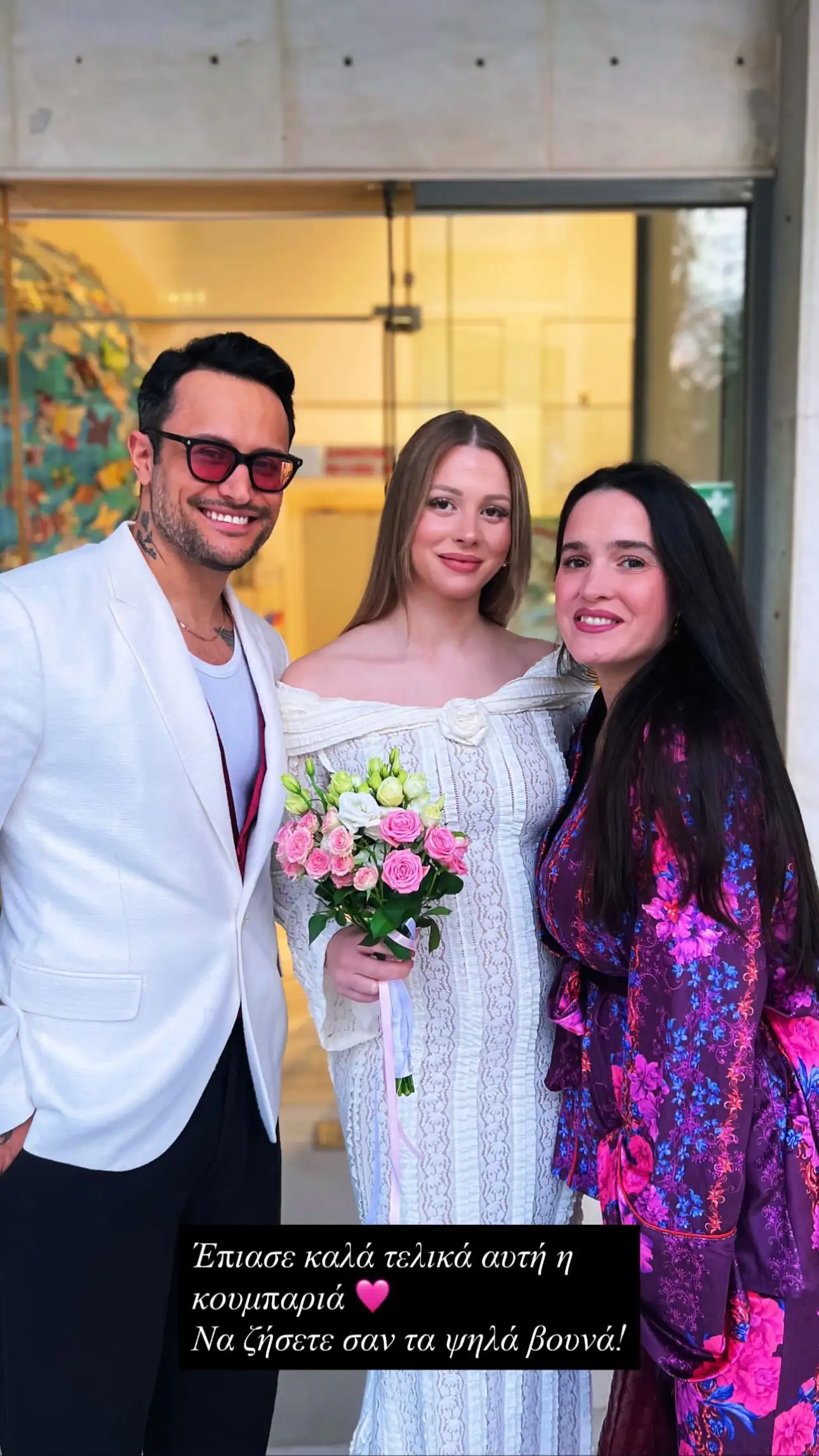 Στις φωτογραφίες βλέπουμε το ζευγάρι στο Δημαρχείο, έχοντας στο πλευρό τους ελάχιστα άτομα. Μεταξύ αυτών και η κουμπάρα τους, η οποία πόζαρε μαζί τους και ανήρτησε το στιγμιότυπο στα social media.