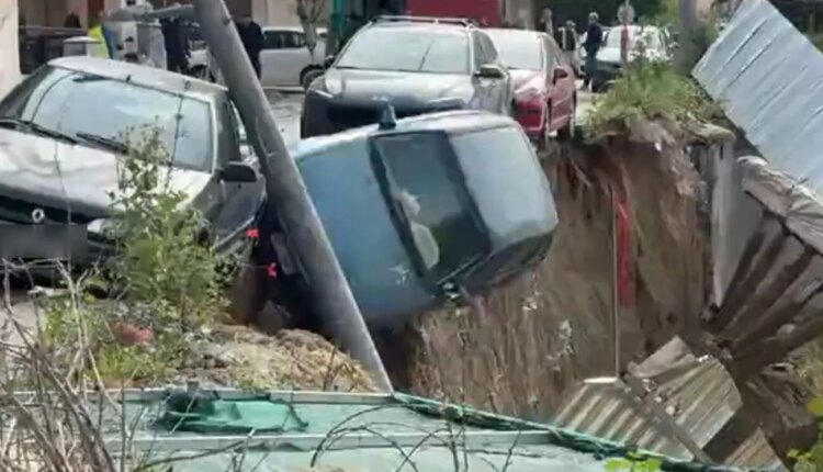 Αποτέλεσμα ήταν να προκληθούν ζημιές σε αυτοκίνητα που ήταν σταθμευμένα στο σημείο, ενώ λίγη ώρα μετά ένα από τα οχήματα έπεσε στο κενό.