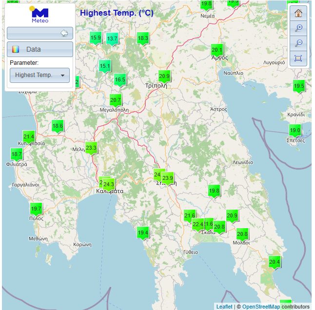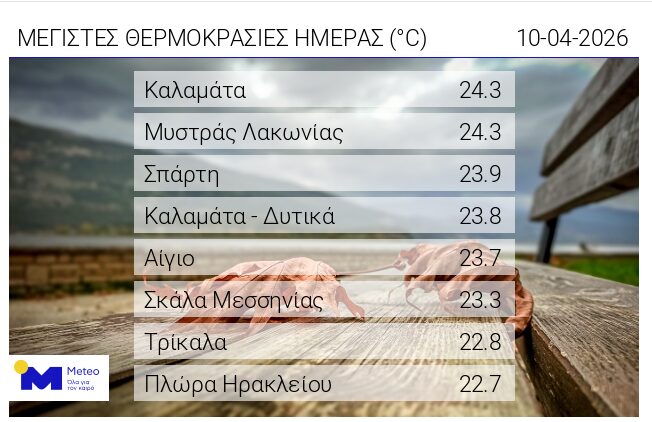Ρεκόρ ημέρας και στη θερμοκρασία, με την Καλαμάτα να σημειώνει την υψηλότερη θερμοκρασία πανελλαδικά. Σύμφωνα με το δίκτυο αυτόματων μετεωρολογικών σταθμών του Εθνικού Αστεροσκοπείου Αθηνών, τους 24.3 °C έδειξε το θερμόμετρο στο κέντρο της πόλης στις 14:30 το μεσημέρι, από τους 11.7 °C που ήταν η θερμοκρασία νωρίς σήμερα το πρωί, και ώρα 07:10.